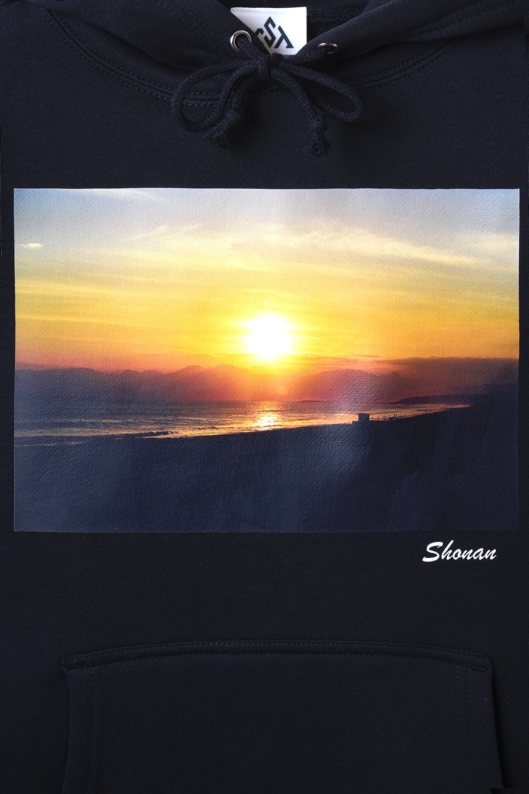 フロントには、鵠沼海岸の夕陽をプリント。オレンジやピンクに染まる幻想的な空が、ブラックのボディに映える一着。シンプルながらも存在感があり、カジュアルにもシックにも着こなせます。